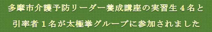 平成25年8月20日(火) 多摩市から介護予防実習生3名と東京都長寿医療センターから1名体験実習に来られました。準備体操・基本・カンフー体操・武式T路を練習しました。 高橋繁雄先生 南長崎第4集会室1F |