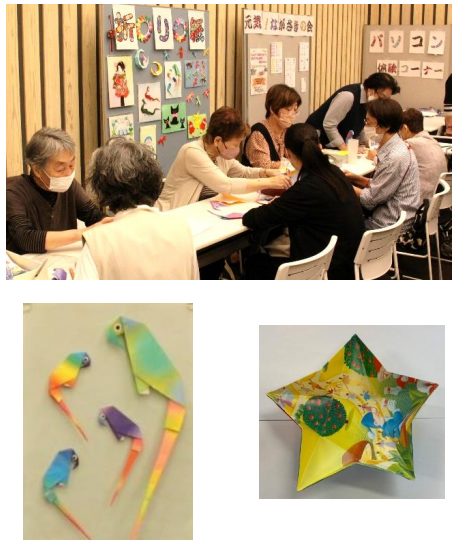 介護予防大作戦は「10 月 16、17 日」と 2 日間、としまセンタースクエアで開催されました。折り紙体験は 16 日でしたが、今年は同じフロアで 歌、フィットネス、太極拳等その他展示コーナーもあり大勢の方がお見えになりました。折り紙グループは「オウム」を 49 名の皆さんに体験して頂き、スタッフからは「星形の入れ物」を差し上げとても喜ばれ「来年もまた来るね」のお言葉を頂戴し、私達スタッフもそのお言葉に疲れも吹き飛ぶ思いで楽しい一日を過ごす事が出来ました。