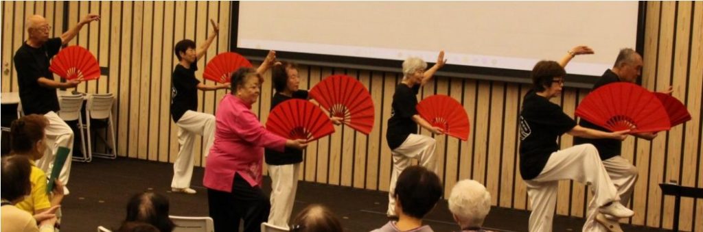 久しぶりのとしまセンタースクエアでの「介護予防大作戦 in としま 2024」だった。太極拳グループは午後の出番で今川先生を真ん中に 7 名で扇子を使った「太極功夫扇」と「陳式扇」、そして 3 曲目に中国政府が太極拳の各流派を整理して入門用に再編した「簡化24式」を演武した。