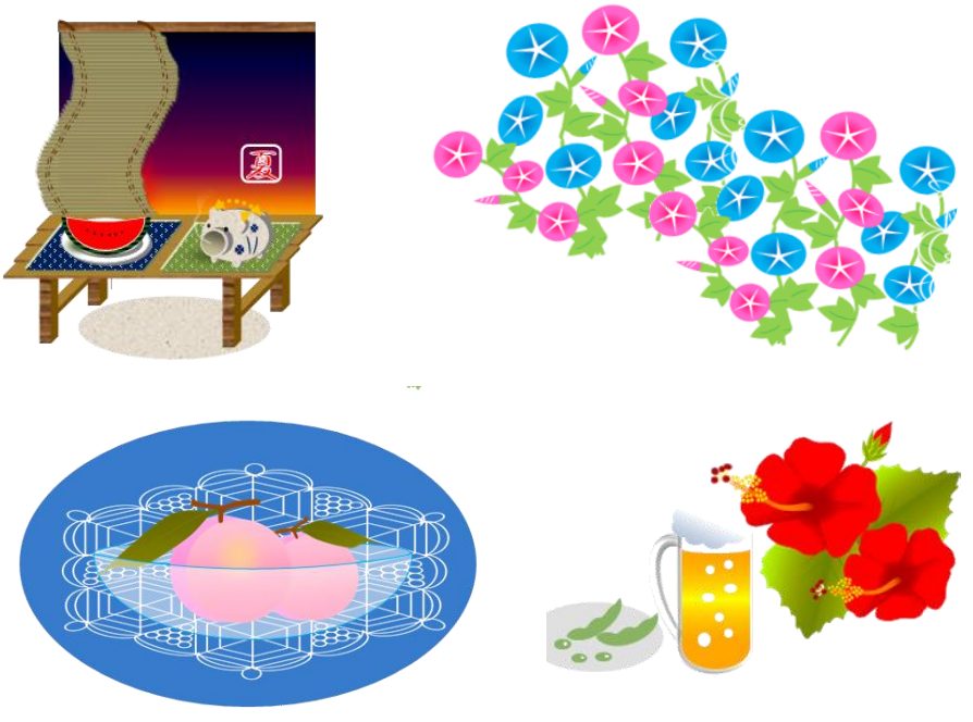 元気!ながさきの会のパソコン教室で、図形を使って四季折々の絵を描いてきました。今回は暑い夏が少しでも涼しく感じられる物を選んで載せました。色をグラデーションにしたり、ぼかしや透明にしたり、教えていただいた事を使って作りました。作った絵はカレンダー、暑中見舞い、一筆箋、ポチ袋などを作る時に使っています。