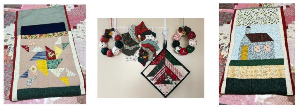 探し物をしていたら、以前パッチワークを習ってた時に作ったサンプラーキルトを使用してタペストリー作成した時に残ったサンプラーキルトが出てきました。又、しまい込んだら二度と出さないかもと思い久しぶりパッチワークを。サンプラーキルトを2枚と以前に購入してた布を使い、落としキルトも頑張って、ノートパソコンを入れるケース?袋?を作りました。パッチワークで物を作る楽しさを思い出し、作りかけで放置していたログキャビンのマットを完成させ食卓テーブルにのせてみるとピッタリのサイズでした。クリスマスも近かったこともあり、クリスマスツリーのミニキルト、ヒイラギのリース、ボンボンのクリスマスリースなどを作成。作り方はそれ程難しくはないけれど、型紙を作成、布選び、型紙を使用し布に写し裁断し縫っていきます。楽しいけれど時間が掛かるのと根を詰めると肩こりが酷くなるので一気に出来ないのが難点ですが、日にちには余裕を持たせたのでクリスマス前には完成!ボンボンのクリスマスリースとクリスマスツリーのミニキルトを孫が欲しいって言うのでプレゼント。飾ってくれたかな?クリスマスツリーのミニキルトは、以前作っていた物と作りかけの物のと2つ有って良かったです。最初から作るとなると大変でした。まだ完成していない作品が他にも有るので出来るだけ完成を目指します。